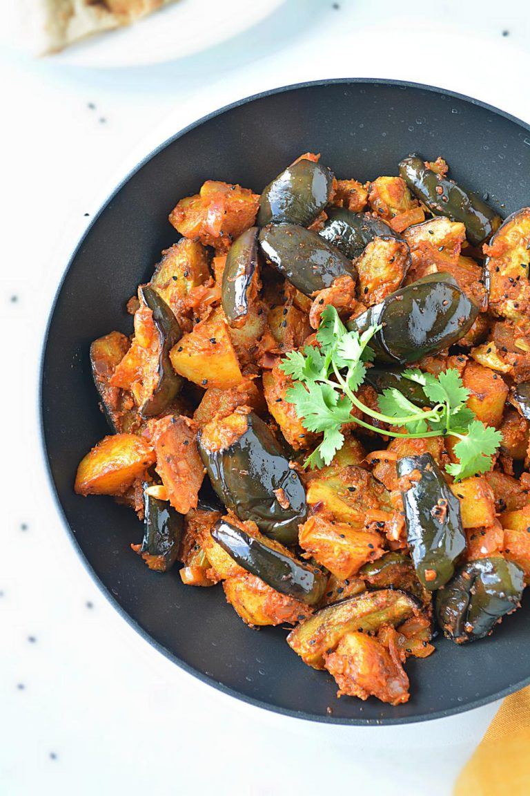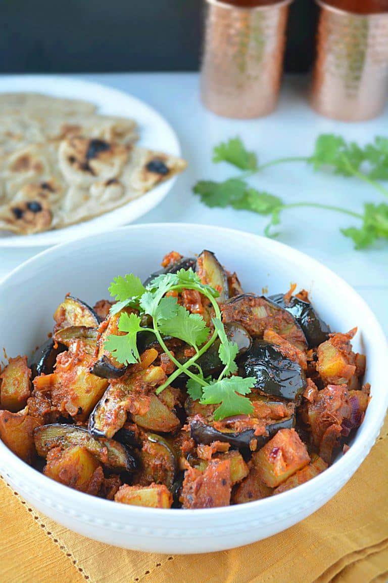 This North Indian eggplant potato curry pairs beautifully with roti, paratha, or dal-rice.