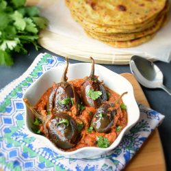 On a healthy note I have skipped frying eggplants rather choose to cook them in the gravy itself. As shown in the recipe, whole eggplant are used but as per one’s liking you can remove the stem, slit them in halves and cook them as pieces. Tamarind paste can be substituted with lemon juice or amchur powder (mango powder). At times you will feel the urge to add more oil to the gravy but don’t go overboard with oil as sesame seeds, cashews and coconut will release its own oil during the cooking process.