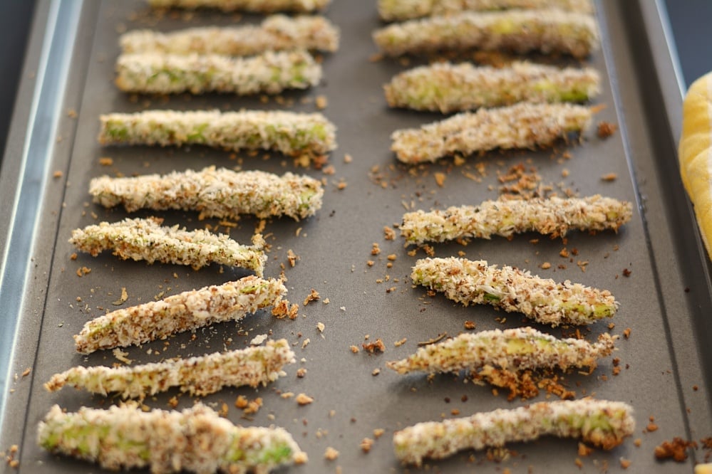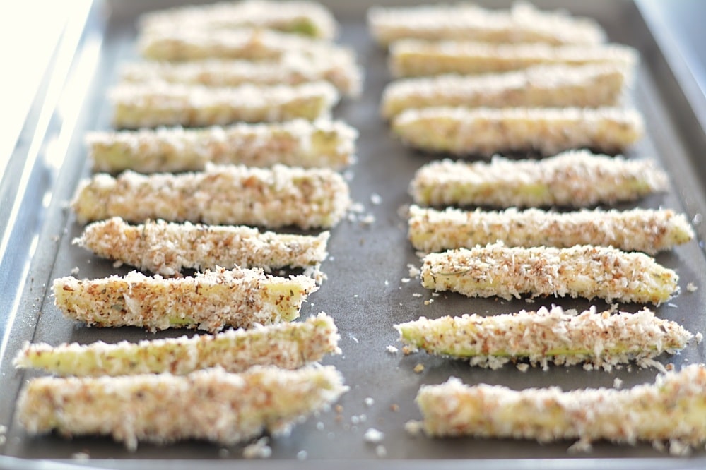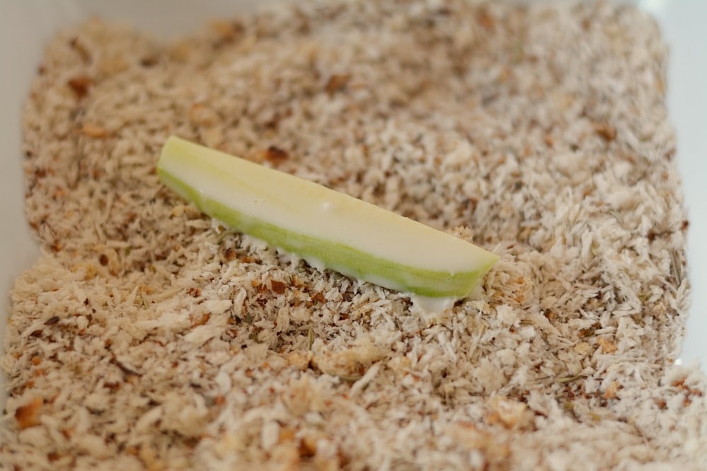- Toss the coated zucchini in breadcrumbs; till it is fully coated with breadcrumbs.