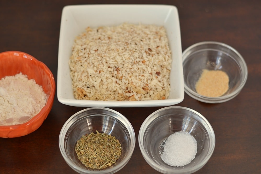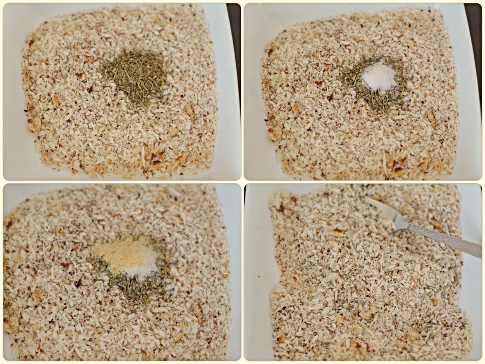- To the breadcrumbs add salt, garlic powder, Italian herb seasoning and mix till it everything is blended.