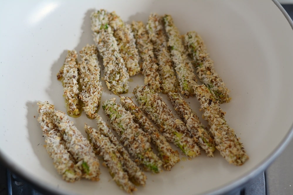 - Now let's try the pan toasted version. Heat olive oil in a pan, add coated zucchini fries to the hot pan. Once brown from one side turn them over using a fork. Keep turning till they are brown and crispy.