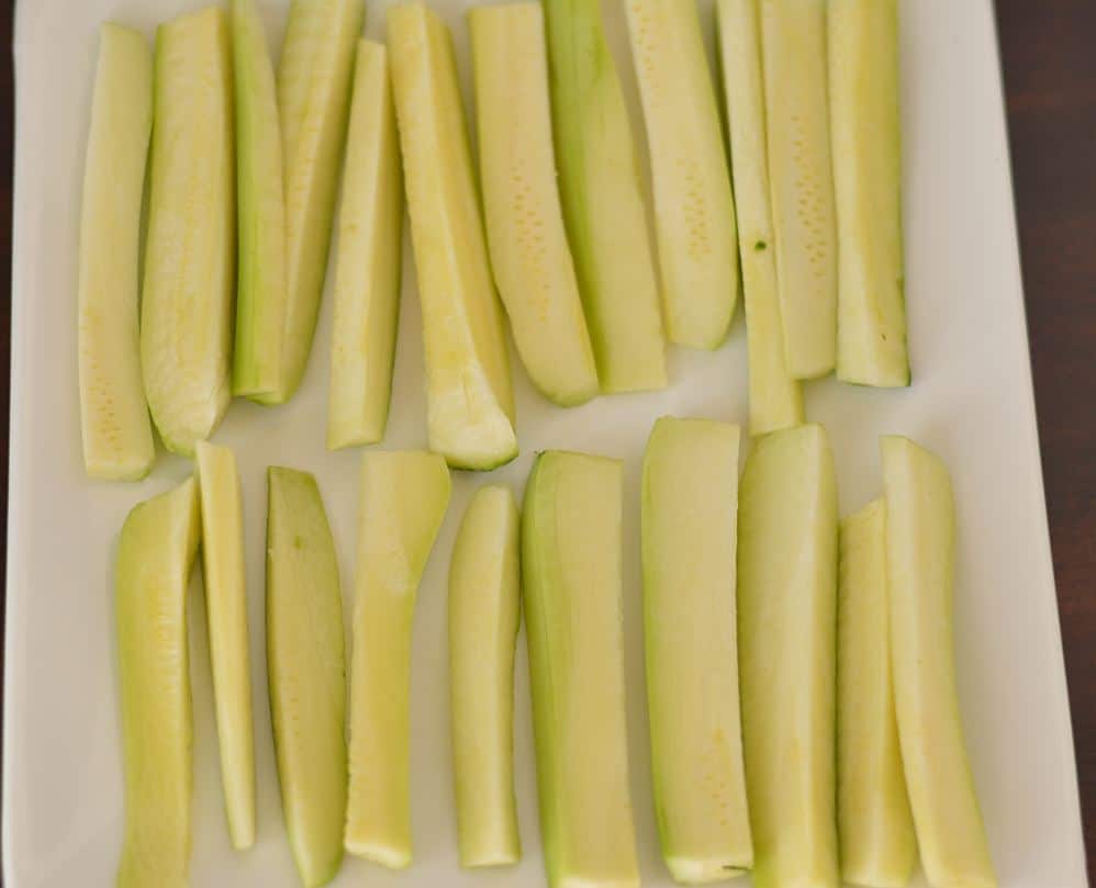 - Trim the top and end part of zucchini. Peel their skin and cut them thinly into slices.