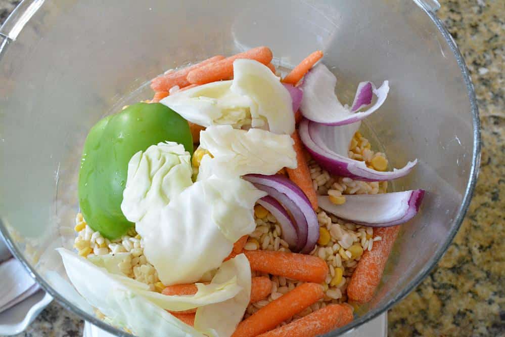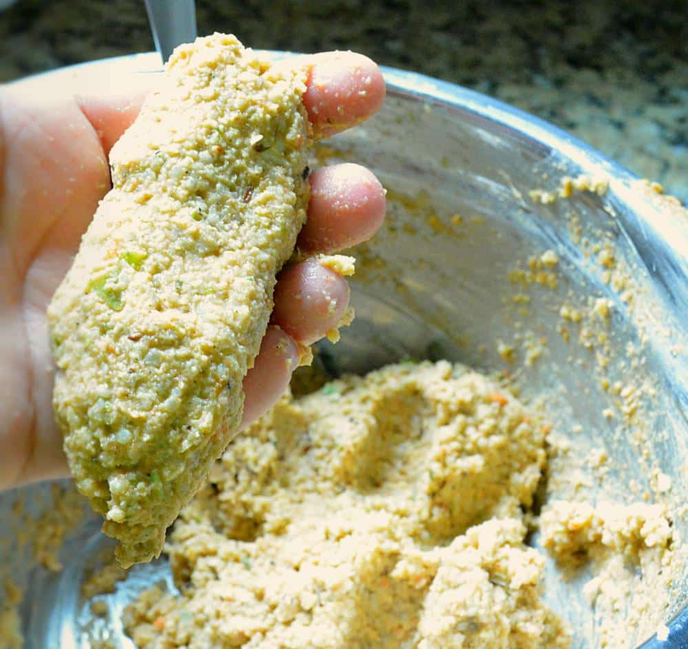 - Add veggies. If using a mixer to grind dal, then please do not add veggies to the mixer. It will make the mixture runny and difficult to handle. Instead finely chop the veggies and add it to the grounded dal later.