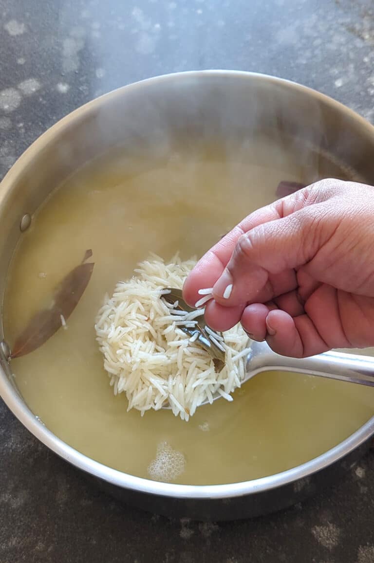 - If it breaks instantly when pressed, then you have overcooked the rice. Refrain from proceeding with this rice, as you will end up with sticky biryani.
