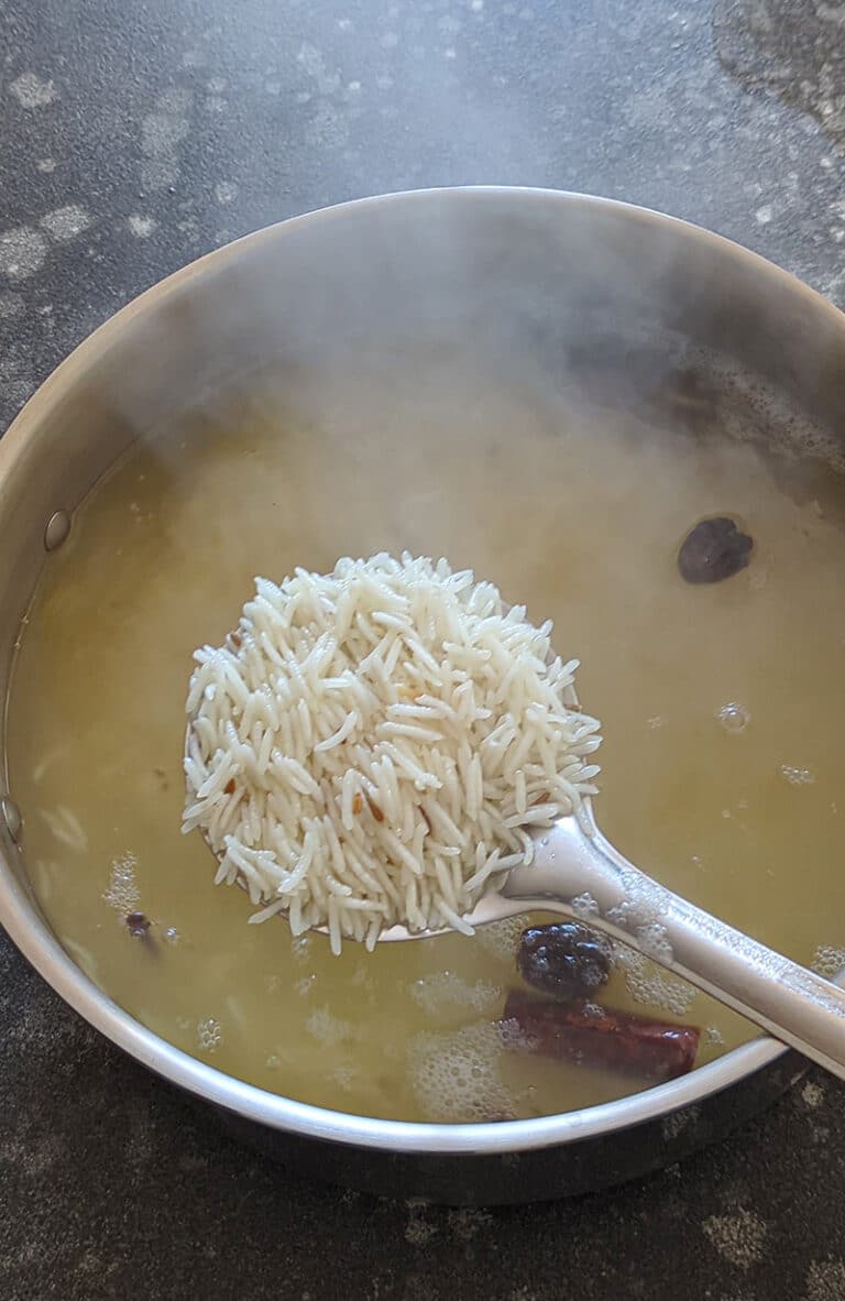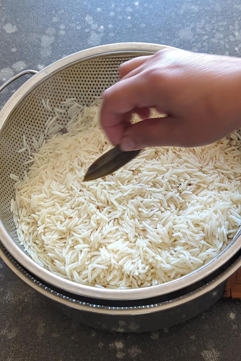 - Once the rice is parboiled, turn the heat off. Remove the rice from the pan and drain it in the strainer. Let the rice stand in the sieve for 2-3 minutes until all the extra water is drained.Tip — Do not cover the rice right away. Let it dry for a few minutes. The rice is now ready for biryani, which needs further cooking.