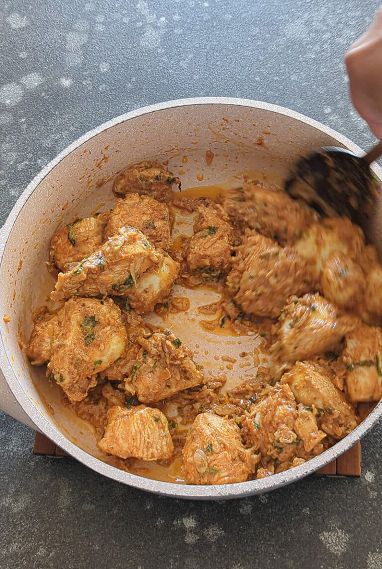 - Cook the chicken pieces for 5-6 minutes over medium heat. You want it mostly cooked. The rest of the cooking will finish in the assembled biryani. Once the cooking time has elapsed, please remove it from the heat and set it aside.