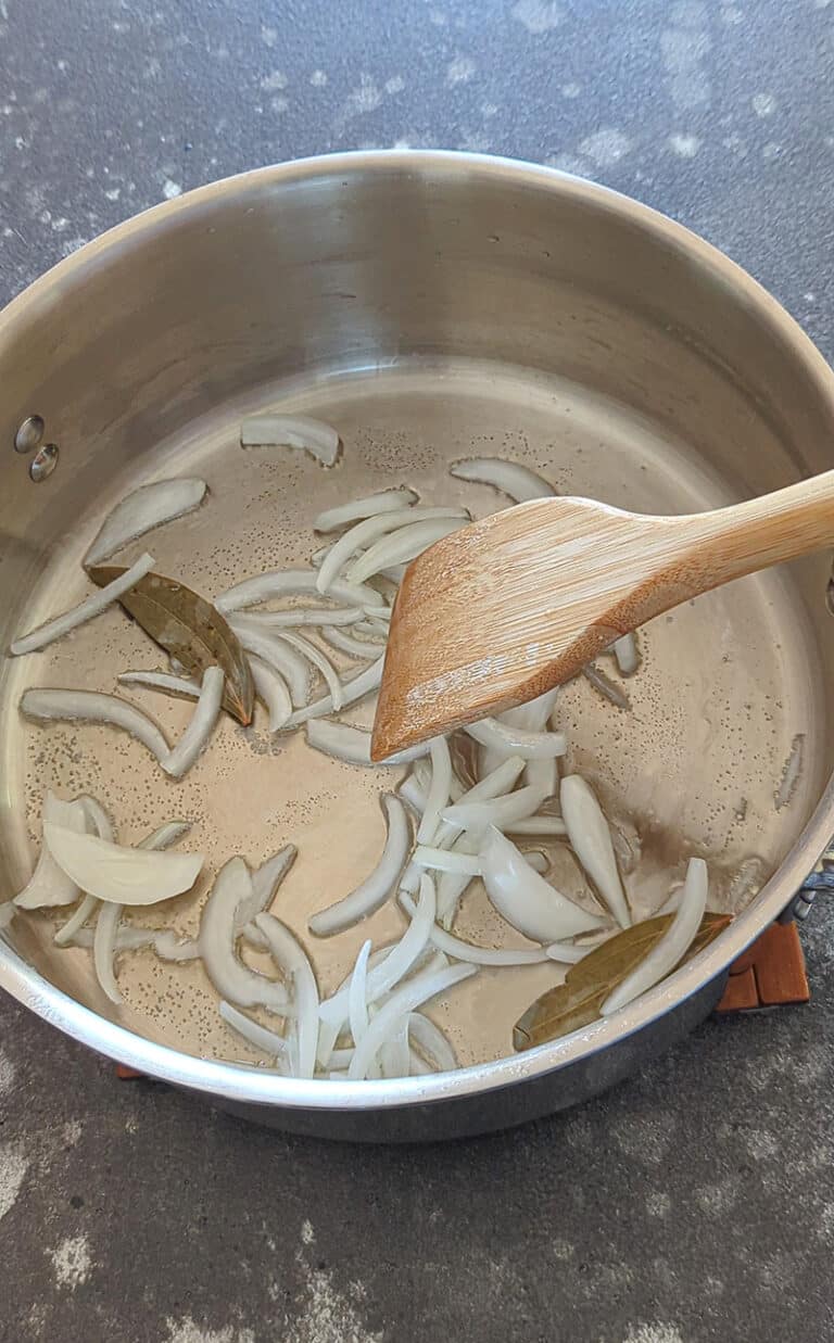 - Time to assemble the chicken biryani. Take a handi or a deep dish pan. Drizzle oil or ghee at its base. Add bay leaves and sliced onions to this pan. Sauté until the onions are translucent.