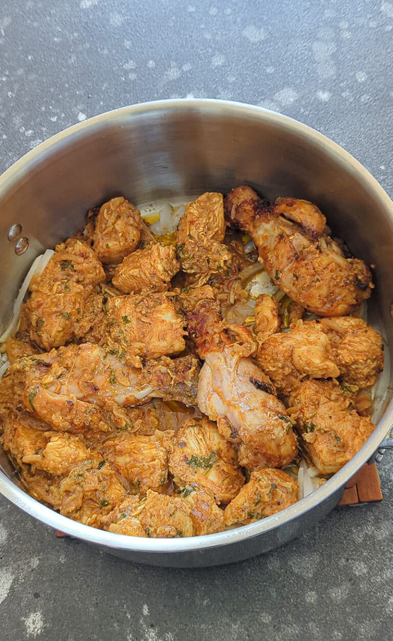 If you are using bone-in thighs, I recommend cooking them separately and then adding them to your biryani to ensure they get fully cooked. There are two ways to do that –