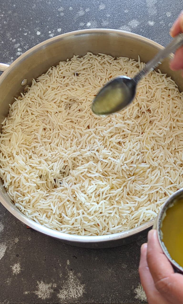 - Layer it with parboiled rice and drizzle a generous amount of ghee over it. Tip — Add a touch of richness. Homemade desi ghee contributes rich flavor and more deliciousness to the recipe; therefore, using it instead of oil or butter is considered healthier.