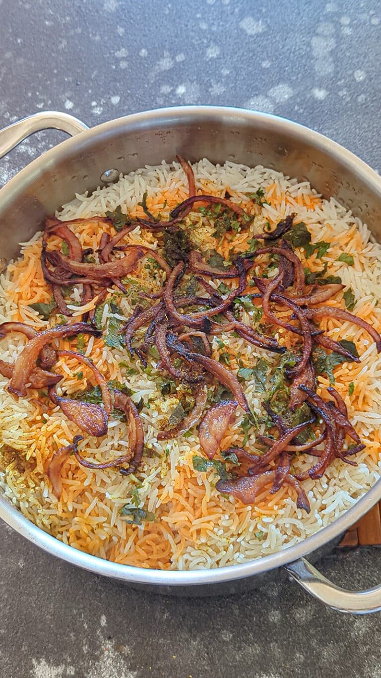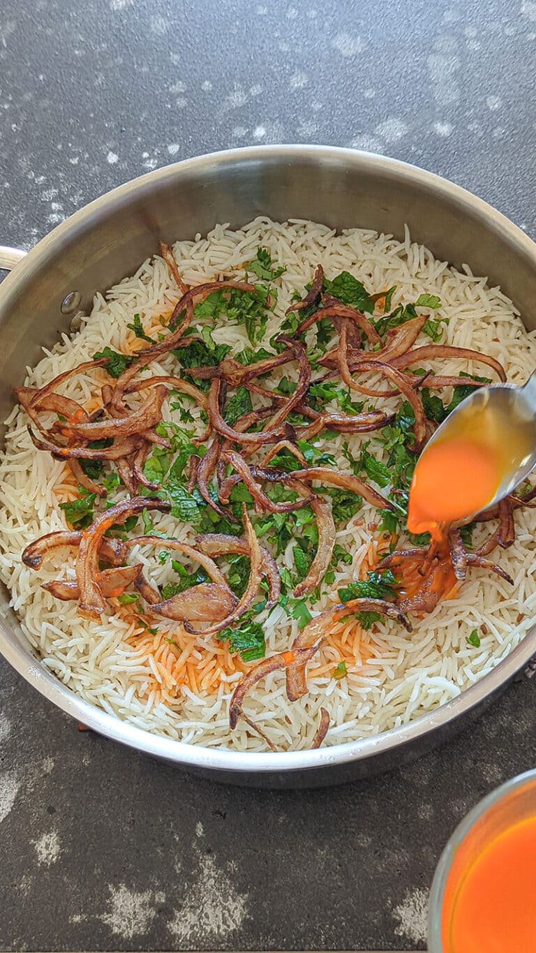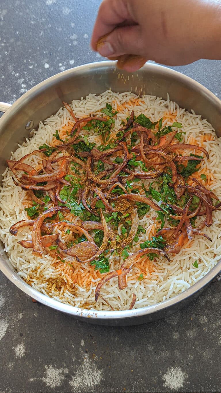 - Layer this delicious biryani with chopped cilantro, mint leaves, and fried onions. Drizzle the saffron milk mixture overtop.