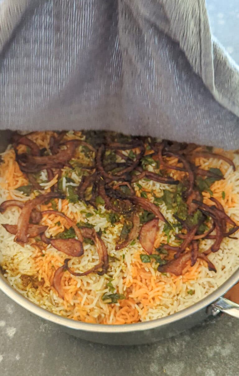 - Cover the pan and seal the cover with a cloth or kneaded dough. Dum, cook for 10-15 minutes until rice is cooked thoroughly and is all fluffy and plump. Tip — The cloth cover adds a little extra seal. It's not quite as good as the dough seal in a traditional biryani, but it will work pretty well.