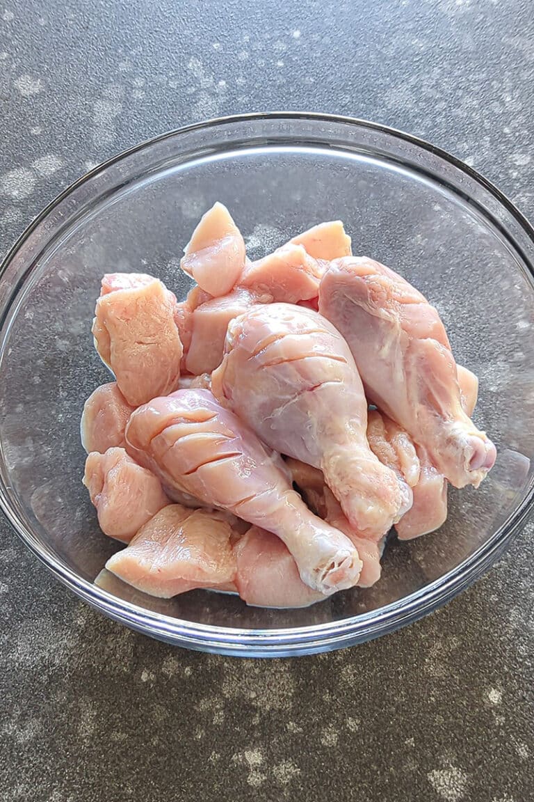 - Clean and wash the chicken pieces thoroughly under tap water. Drain the water completely.