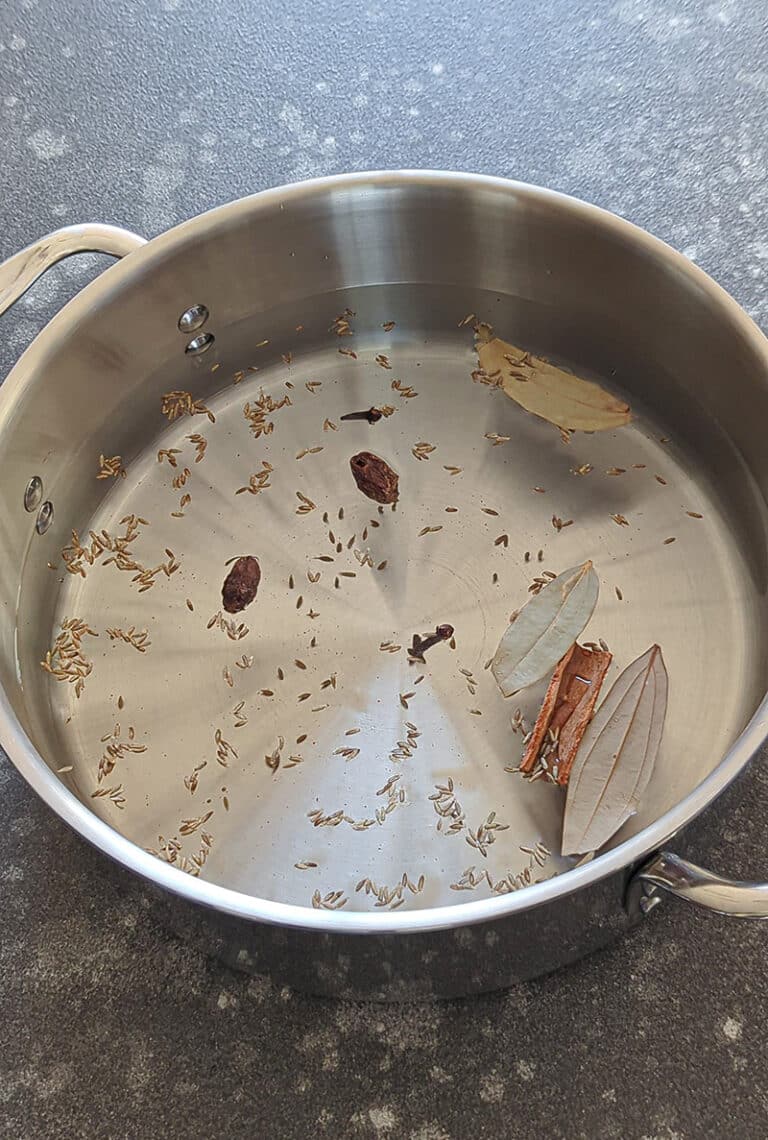 - Add water to a large pan which has a tight-fitting lid. Flavor the water with whole spices, cumin seeds, and salt.