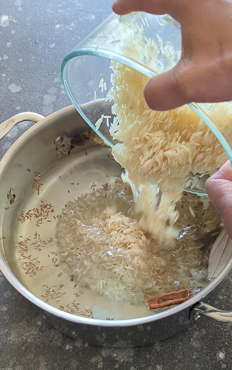 - Add rinsed rice to this water. Give it a good stir. Bring it to a simmer over medium heat. Simmer the rice for 10 minutes, uncovered. Tip — When the rice is cooked in spiced water, it absorbs water and gains flavor and aroma.