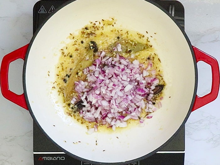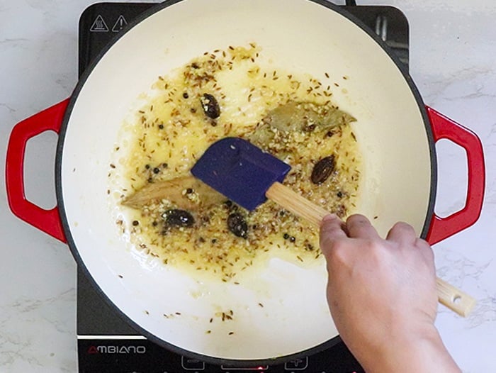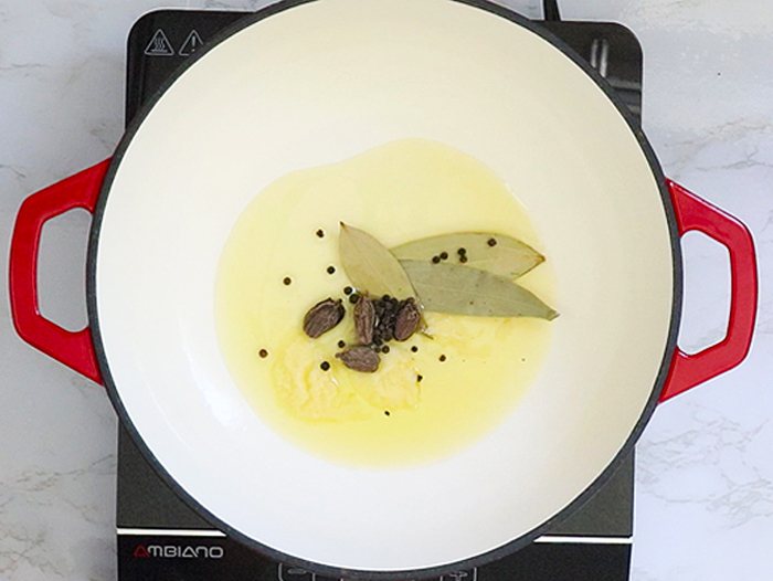 - Heat ghee in a heavy-bottomed pan. Add bay leaves, whole back cardamom, and black peppercorns to the pan. Sauté the whole spices until they turn a beautiful golden brown color.