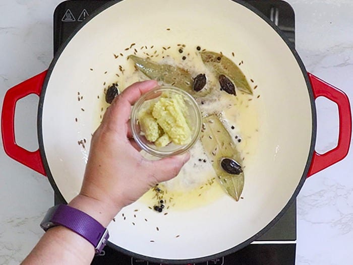 4. Once the whole spices have released their aroma, add ginger and garlic paste.