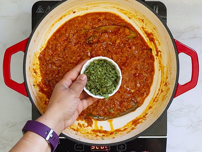 - Now add kasoori methi. Cook until the oil separates.