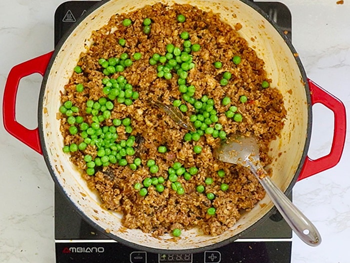 Since the base of Indian recipes is a blend of onion-ginger-garlic-tomato, you can speed up the cooking process of Keema matar dramatically by using these simple precooked masala.