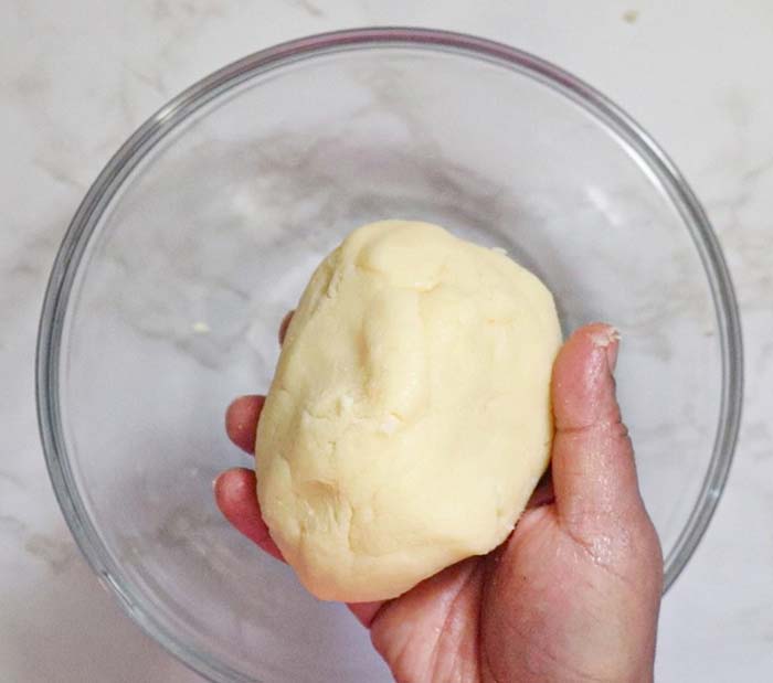 - Allow both the mixtures to rest for 20 minutes. Keep mixing the peda mix as it cools. Depending on the quality of milk powder, the peda mixture may feel dry, add 2 teaspoons of melted ghee and knead the dough.