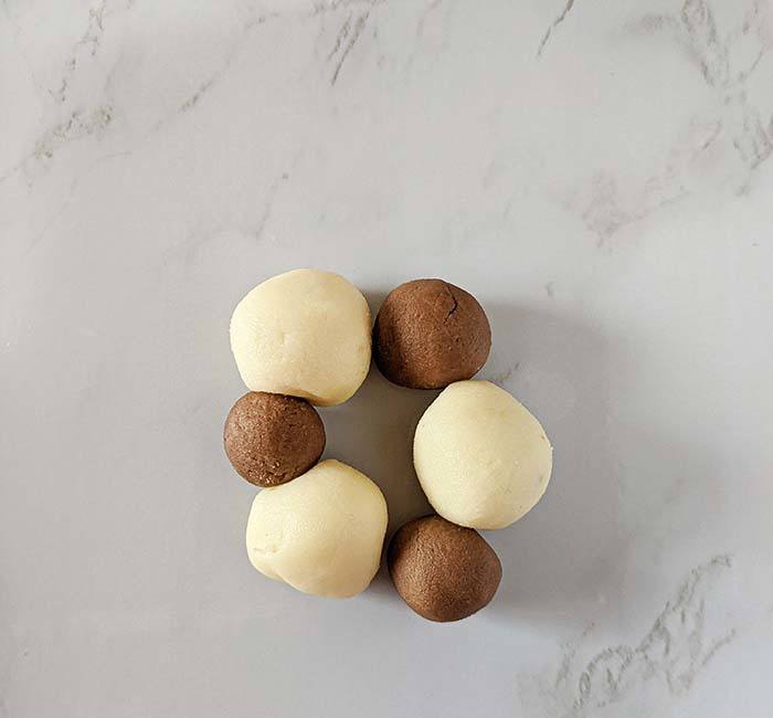 - Likewise, roll the chocolate dough into small balls, about 5-6 grams each.