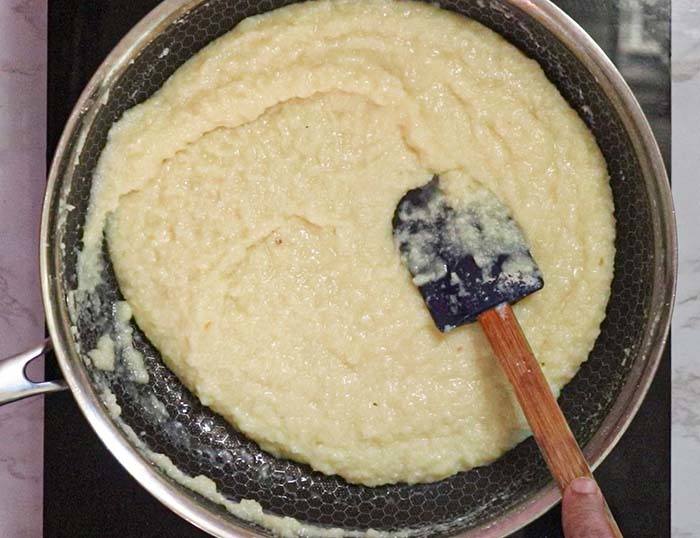 - The mixture will be grainy but lump-free. Do not cook after this point, as the pedas will become chewy.