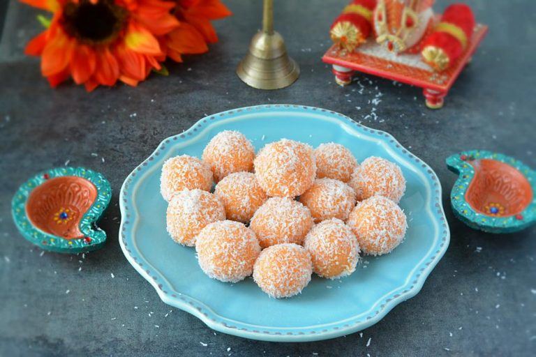 If you are looking for a last minute sweet for Ganesh Chaturthi then try out these yummy and mouthwatering coconut ladoos. A beginner’s recipe that can be prepared in just 15 minutes. Quick and easy ladoos that are made with mawa, unsweetened desiccated coconut and condensed milk. Mawa/khoya adds a rich taste and perfect texture to these ladoos and they will just melt-in-your-mouth from the first bite you take. I have prepared these ladoos for Ganesh Chaturthi but they can be enjoyed at any festive occasion.