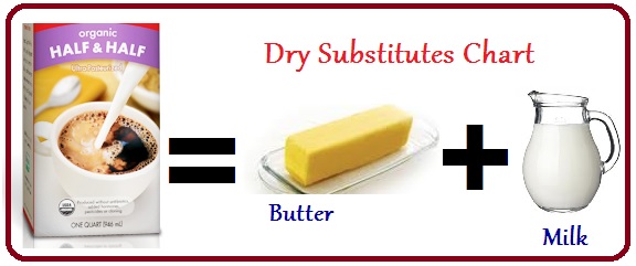 | Half-n-Half | 1 Cup | Mix 4-1/2 teaspoons melted butter + enough Full cream milk to equal 1 cup. |