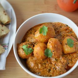 Baby potatoes can be substituted with regular potatoes. Regular potatoes are a bit on the larger side, so cut them into halves.Gravy was prepared using tomato puree, curd and cashew paste as a base and later flavored with all the aromatic spices. Cashew paste is an excellent substitute to onion-garlic based gravies. Not only it thickens the sauce, it also neutralizes the tanginess of tomatoes and add that creamy touch to the gravy.
