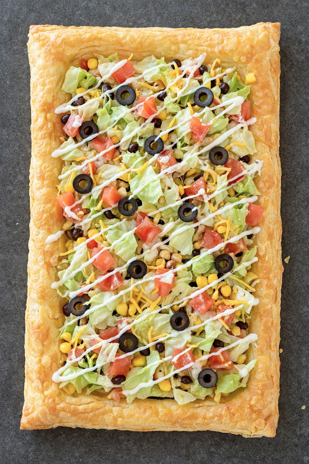 From the buttery puff pastry crust to the fresh lettuce, tomatoes, olives, and sour cream on top, every layer makes this pizza completely irresistible.