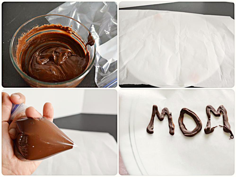 - This step is optional - If you like to make chocolate words then warm up 1 cup of chocolate in a microwavable bowl for 2 minutes. Beat till its liquid. Pour the batter in a plastic bag and make a cone. Spread a wax paper on the counter and write letters using hot chocolate.