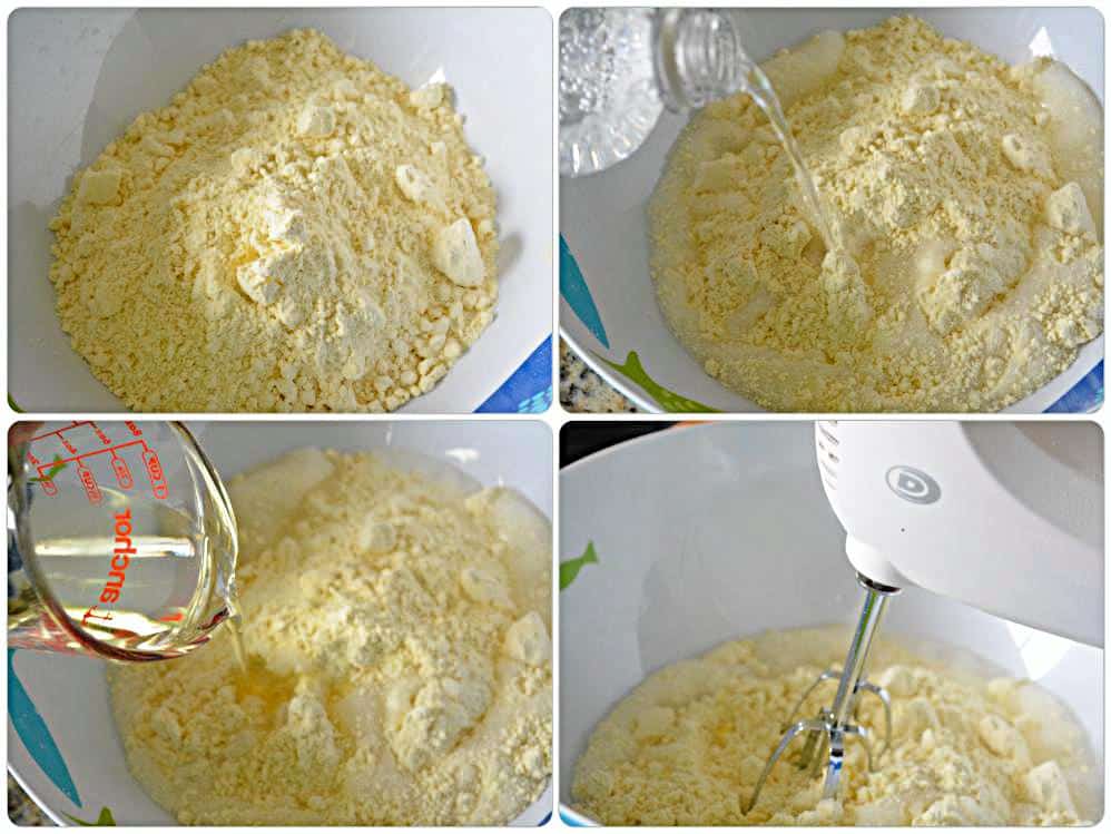 - In a large bowl empty cake mix and add the ingredients one by one and beat...