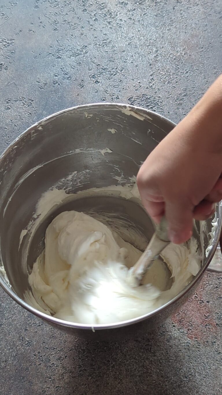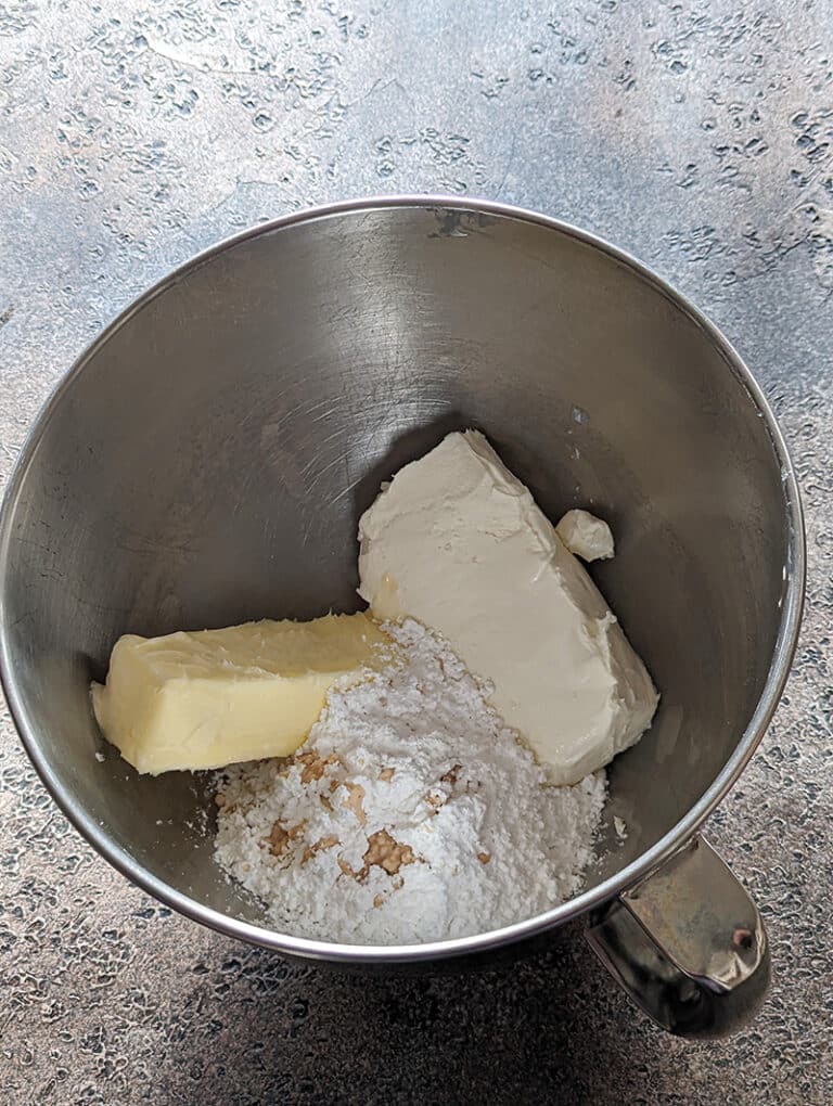 Cream cheese — Always use ingredients at room temperature as they mix uniformly and incorporate evenly into the batter. Here, you can start with room-temperature cream cheese for the best results. If the cream cheese is cold, you’ll have a lumpy frosting.