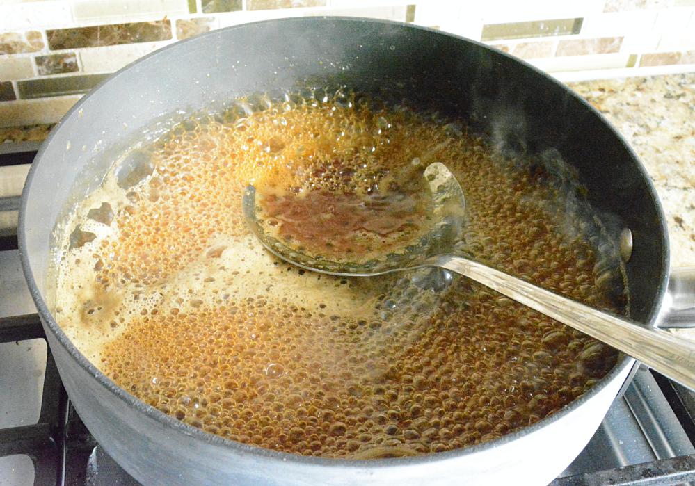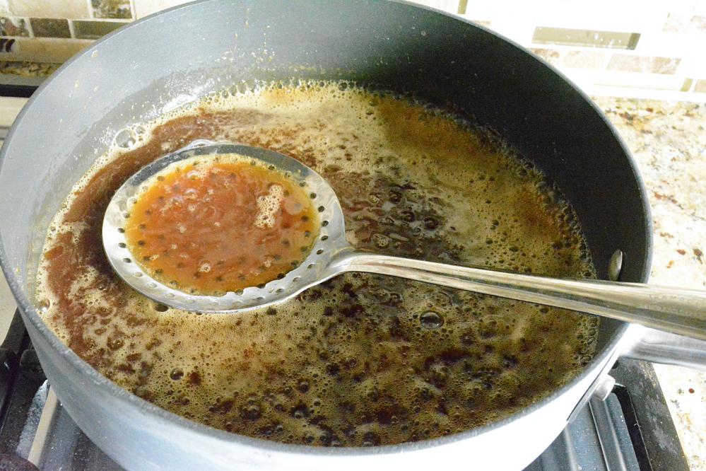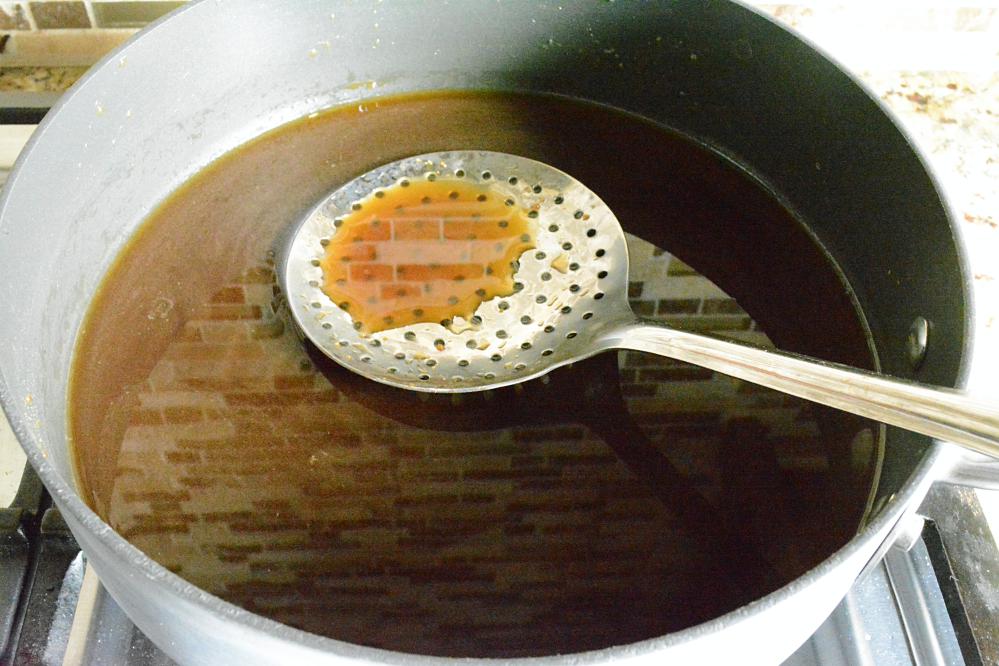 Prepare the syrup by boiling gur/jaggery in water until it is reduced to half its quantity. Gur/jaggery burns very fast, so do not leave the syrup unattended and keep stirring it continuously.