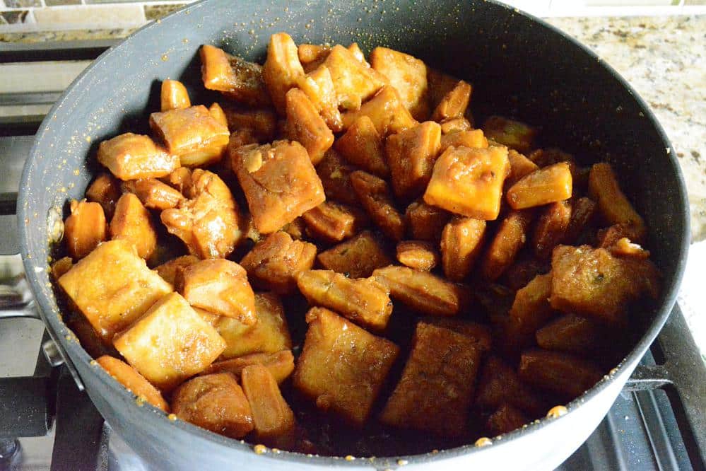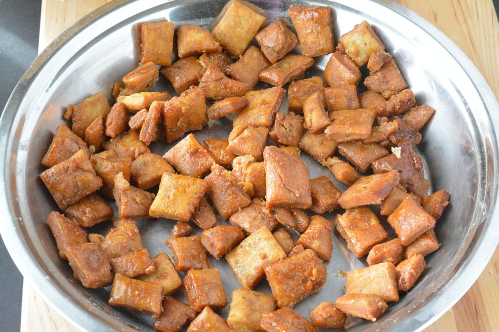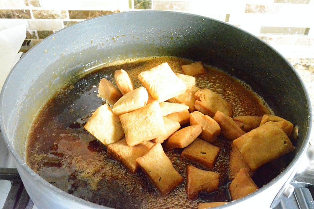 Remove from flame and toss gur pare in this syrup. They will soak up all the syrup and will become sticky and soft. No worries – spread them on a big plate in a single layer and let them dry out.