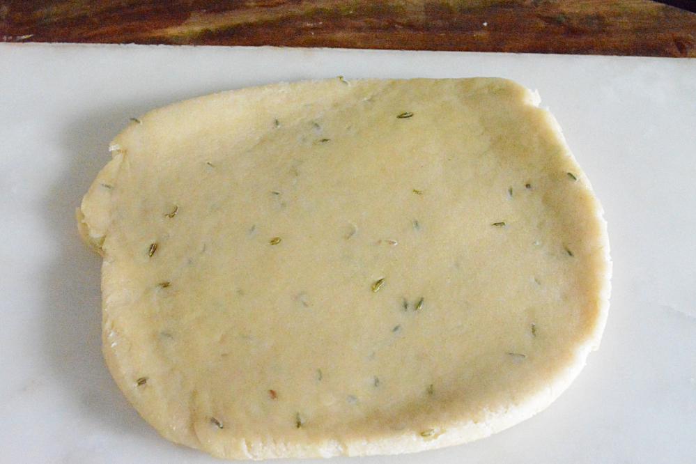 - Sift flour and baking soda together. Add roasted saunf and pour ghee in the center.