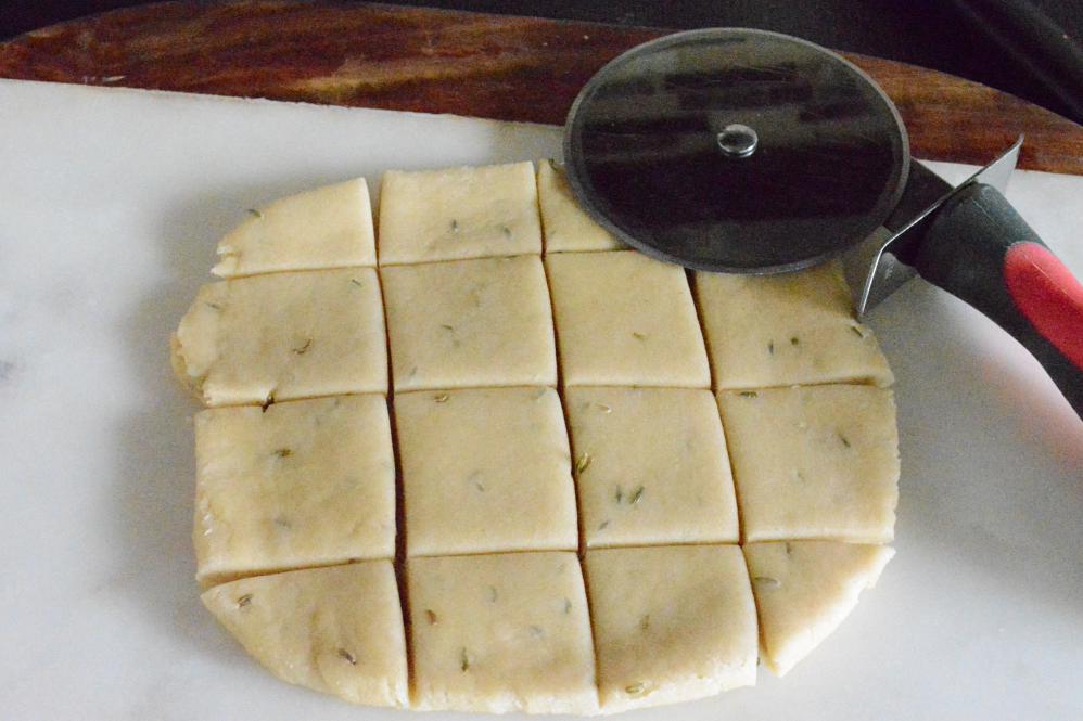 After the resting time, roll out the dough into a big circle, cut squares and deep fry the gur pare in hot oil/ghee until golden brown.