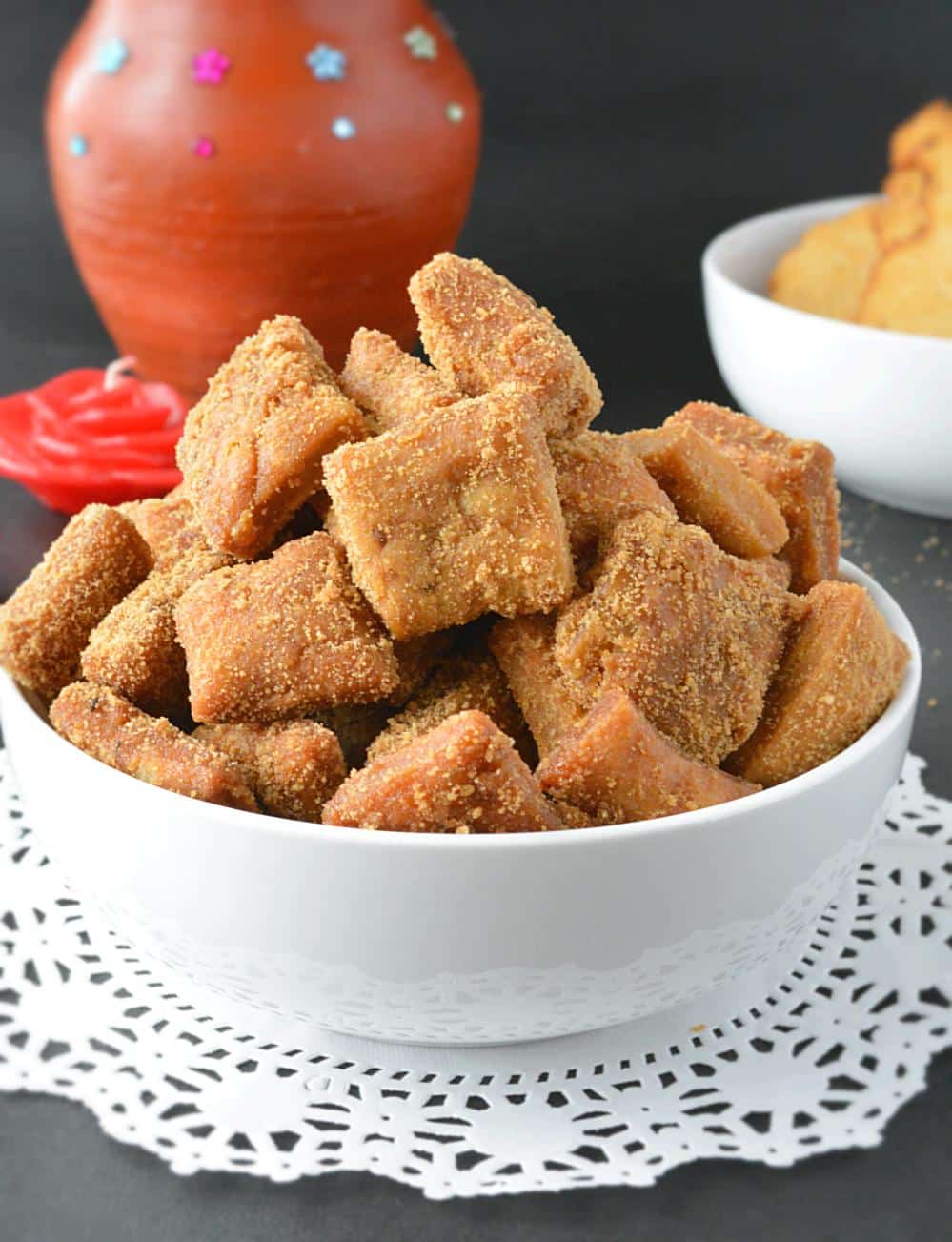 Gur Para literally translates to delicious crispy sweet bites made with wheat flour and jaggery. This traditional Punjabi sweet ~ Gur Para or Gur Pare Recipe require a small list of pantry essentials and is specially made during the festive season or on special occasions.
