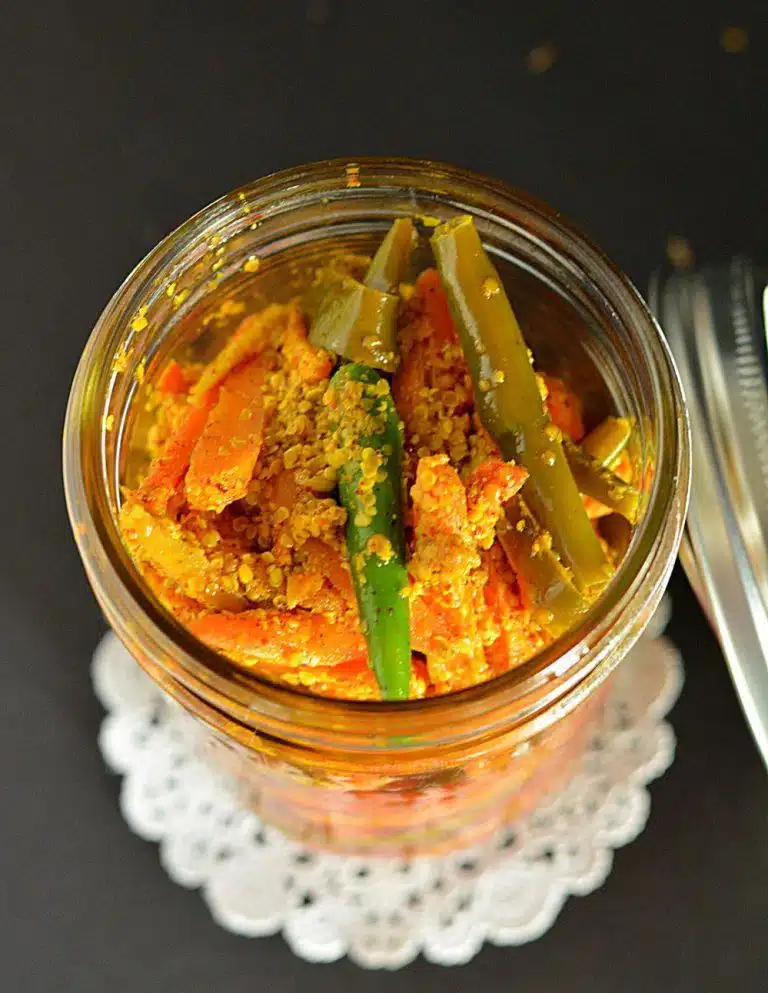 - Transfer the achar to a clean jar. If needed, heat more oil and pour over the achar. Pickle needs to be covered in oil at all times.