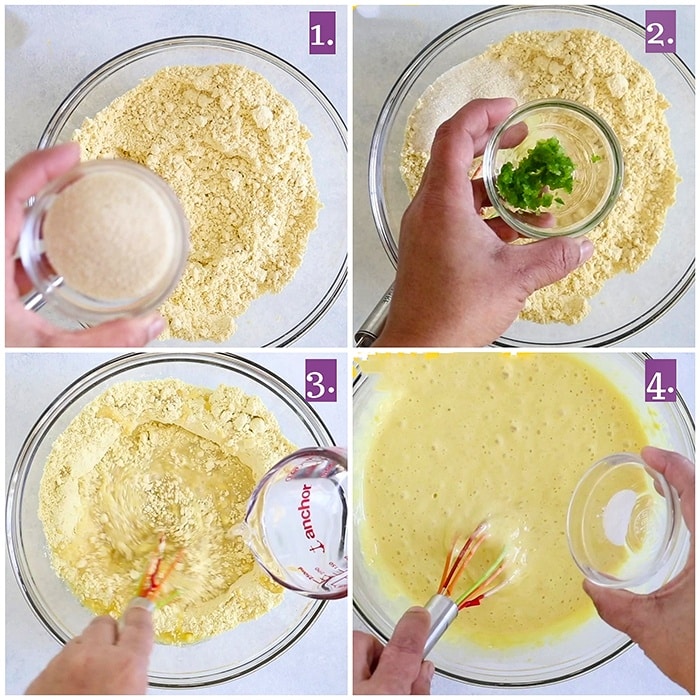 1. In a large bowl, add chickpea flour, sooji, hing, salt, and sugar. You can store this mix in an airtight container and when ready mix in the ingredients mentioned under – “wet ingredients.”