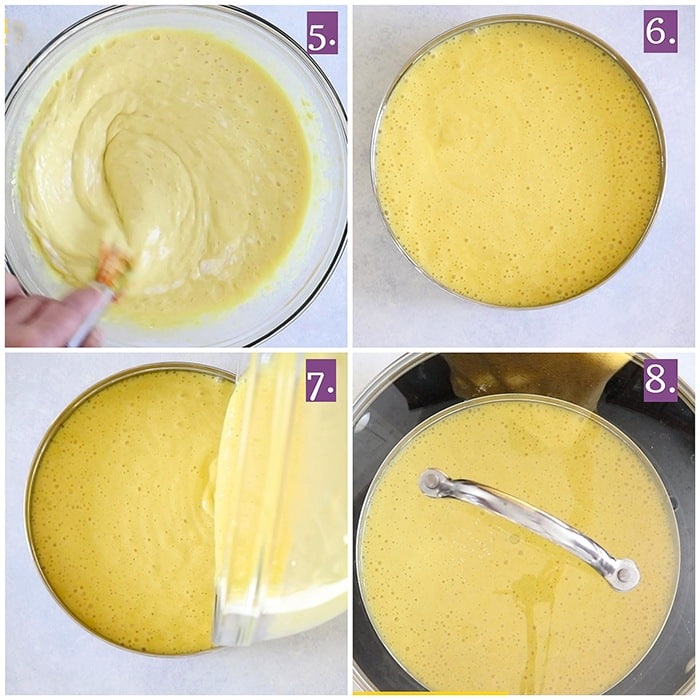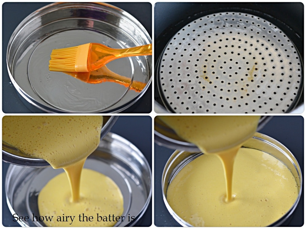 - Fill a large pan with water and place a trivet at the base. Instantly transfer the batter to a greased container. Place this container over the trivet.