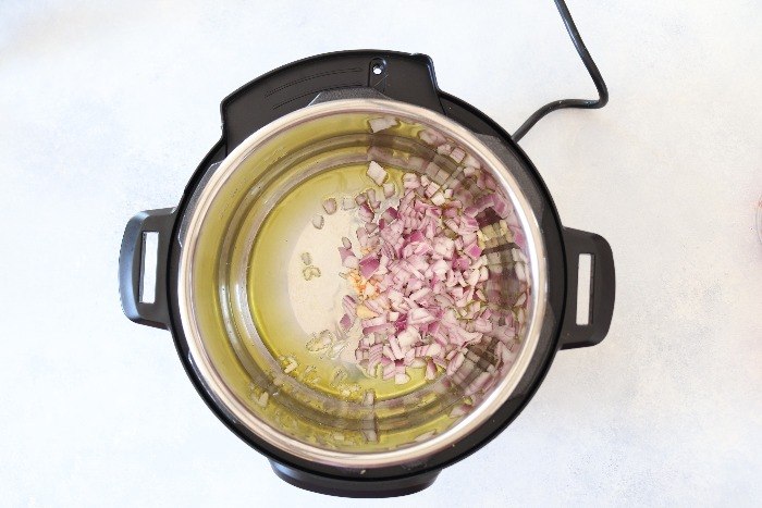 - First, rinse the beans well under tap water for a couple of minutes. Set it aside. Press the saute button on the Instant Pot. Add olive oil, onion, and garlic.
