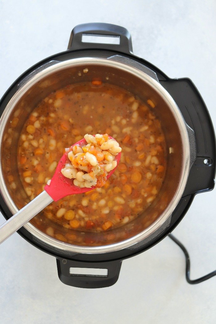- When the Instant Pot beeps, let the pressure release naturally (it will take 20 minutes) and when the pin drops, open the lid. Check beans for doneness. They should be soft and tender. For a creamier soup, spoon out some beans in a bowl. Gently mash the beans. Return the mashed beans back to the Instant Pot and allow the soup to simmer for a couple of minutes. The starch from the mashed beans will thicken the soup and make it so creamy and hearty that everyone will just love it!