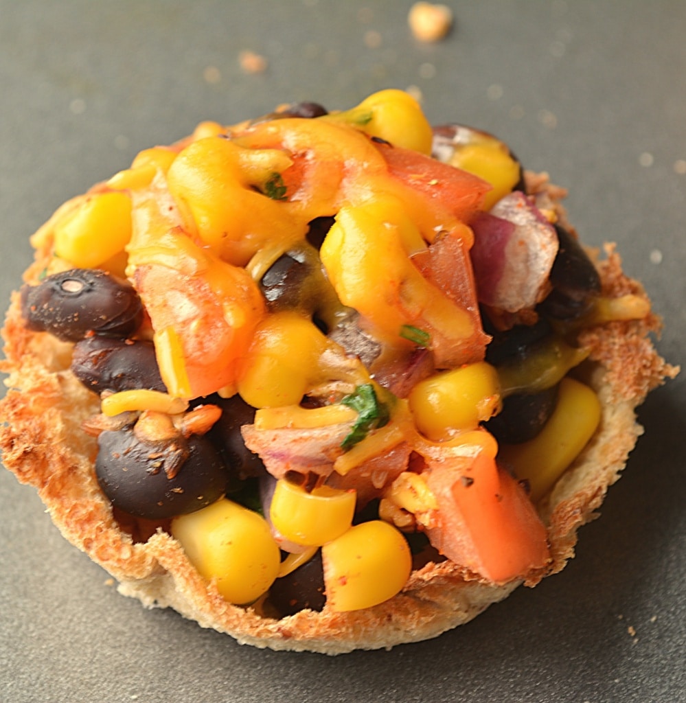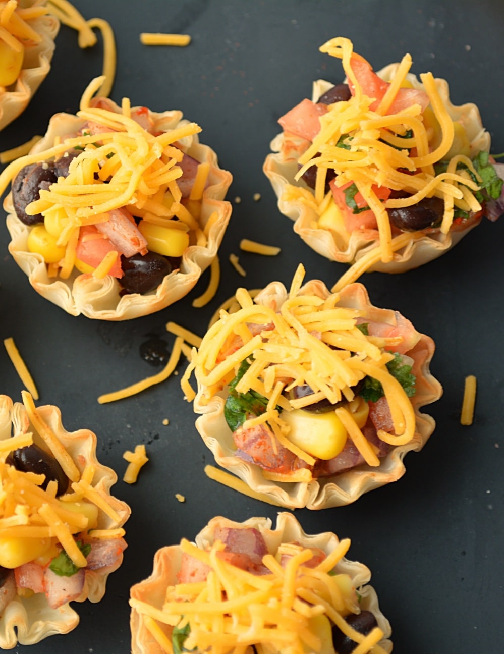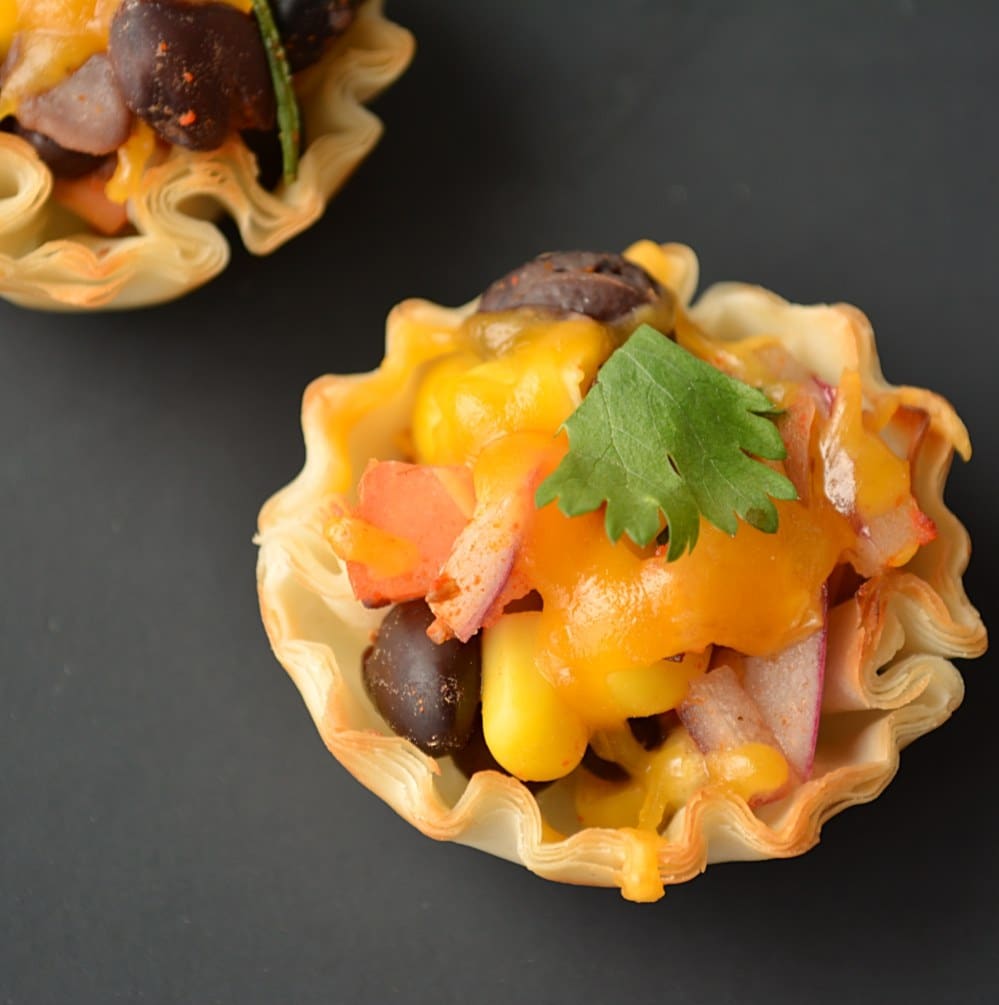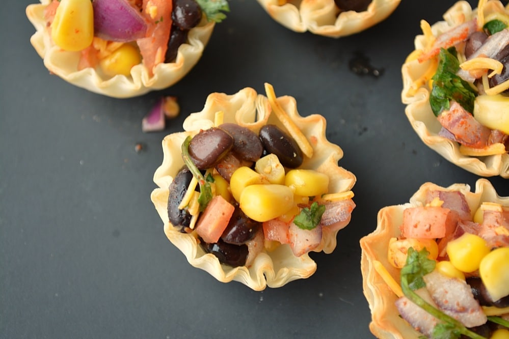 Deliciously baked Mexican veggie bowls are a perfect bite size appetizer for a birthday party, potluck dinner, game night or simple dinners to name a few. Corn kernels tossed with versatile black beans and spices make a great filling for these mini Phyllo/Fillo shells.This recipe is prepared with store bought Phyllo/Fillo mini shells but you can make these with bread slices. I have shown a step by step recipe below about how to make bread bowls. Save the leftovers of bread slices to make homemade breadcrumbs. What I love about these mini munchies is that they are everyone’s favorite and a crowd pleasing appetizer. To top that these are MADE IN 30 MINUTES!!