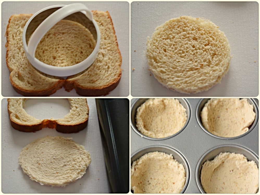 - Take a bread slice and using a cutter or katoori, cut a circle out of it. Using a rolling pin flatten out the bread circle. Take a muffin pan and press the bread circle firmly inside it.
