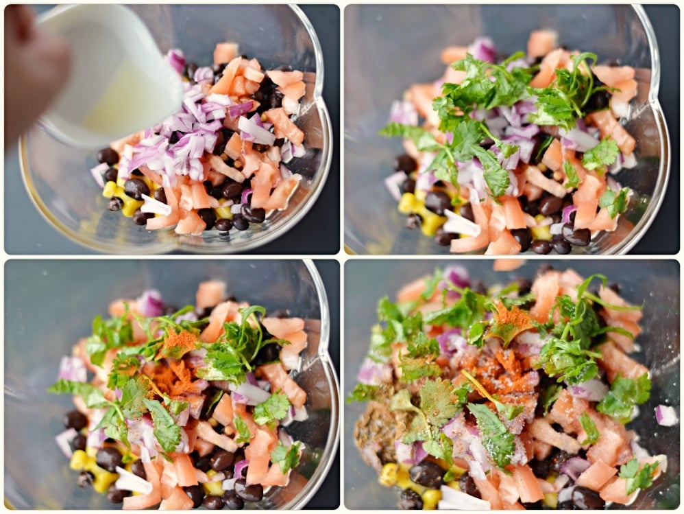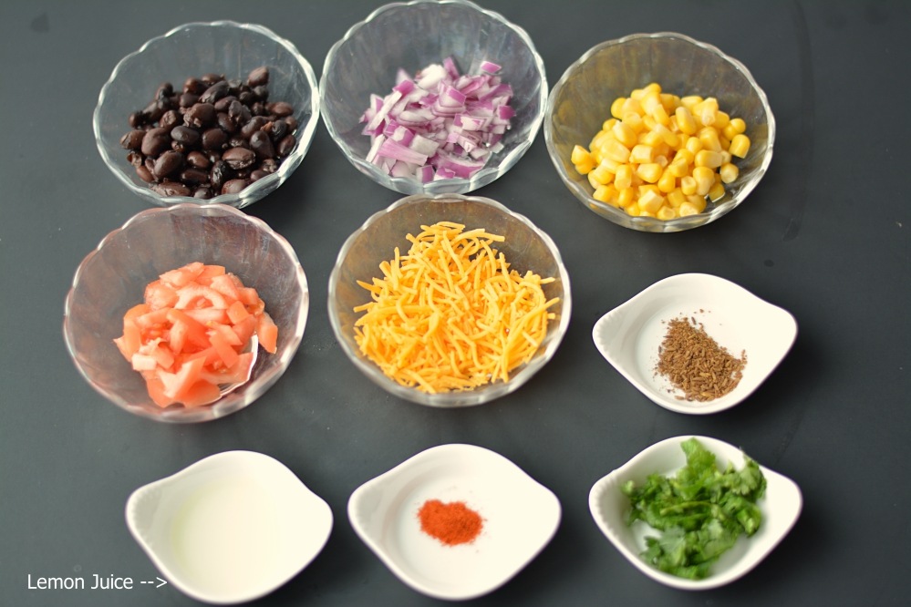 For this recipe I have used store bought corn kernels, washed them of their liquid and used them as a filling. You can even use frozen corn kernels. Black beans can be substituted with black eyed beans (lobia) or whole black beans (sabut Urad lentils). After everything has been tossed start filling up the bowls because if this mixture is left to sit, it will get watery. Finish this appetizer at the last minute 10 minutes before everyone start arriving. Fill them up, bake them till cheese melts, top them with a dollop of sour cream and you are all set to welcome your guests.