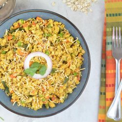 Oats poha or savory oats hash is a heart- healthy breakfast recipe, quick and simple enough for a busy morning. Prepared with just basic ingredients, it’s a well-rounded one pot healthy breakfast recipe – ready in 15 minutes!