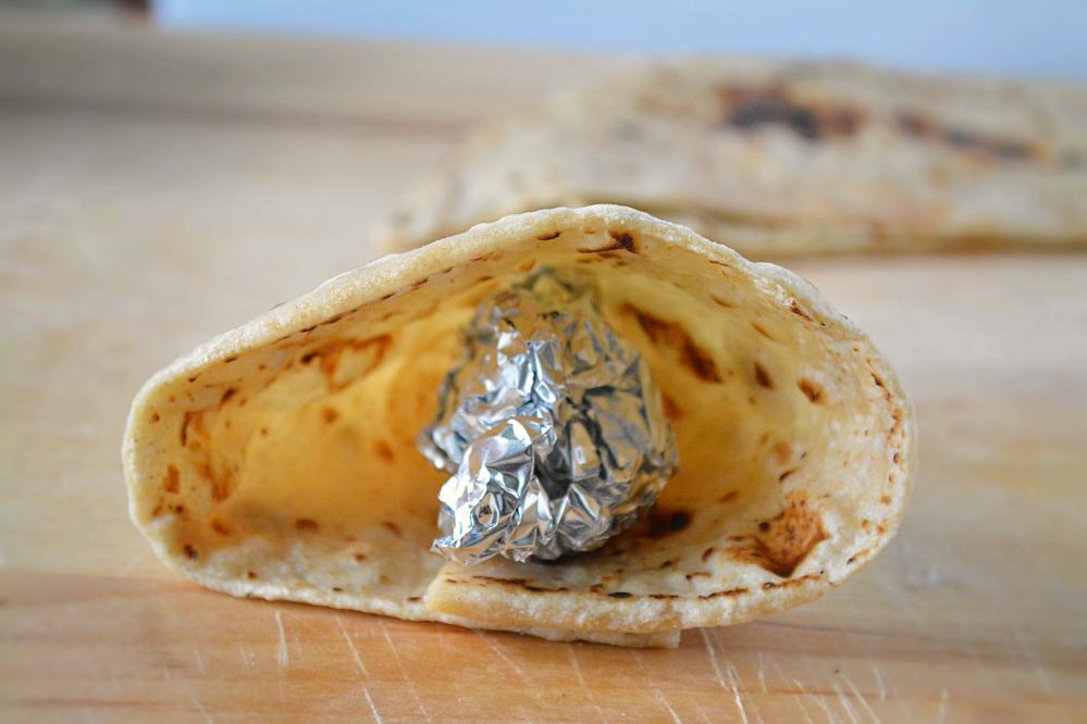 If you have no leftover rotis, knead the dough and make some fresh chapatis/rotis (Indian flat-bread). Shape them like cones and heat them in oven for 10 minutes or till they are barely crisp. They will have a slightly crunchy outer covering and a moist and juicy stuffing. 🙂 These cones can be made in OTG ovens.