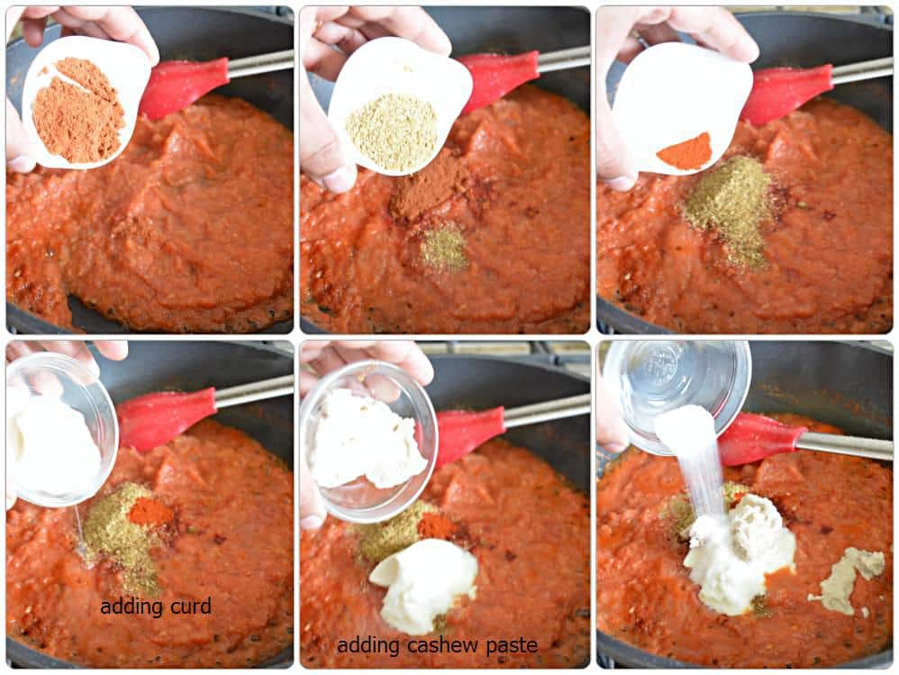 - Mix and stir in all the spices, curd and cashew paste. Mix and saute for 5-6 minutes on medium flame.