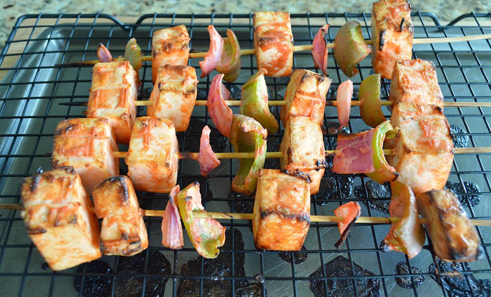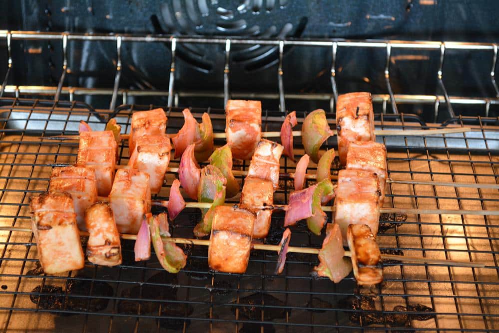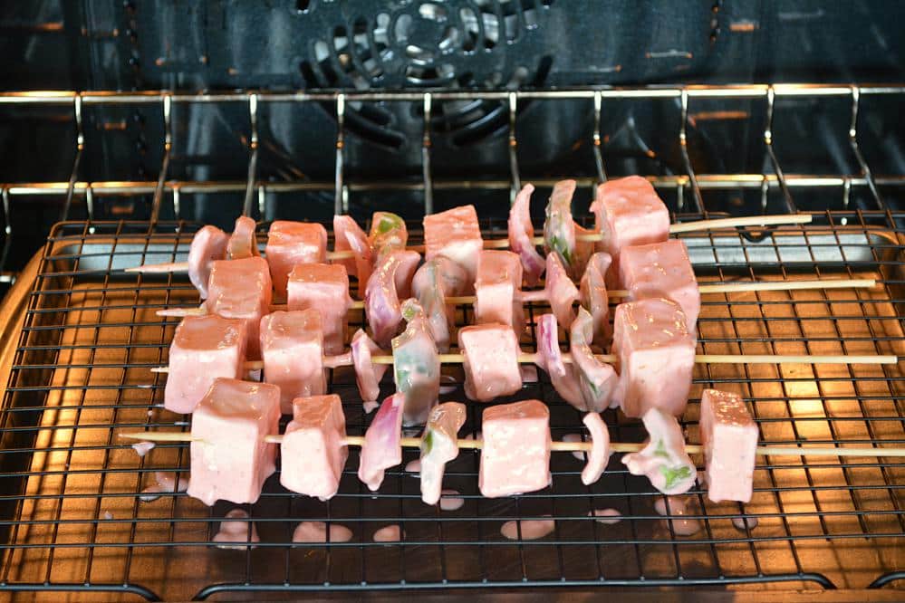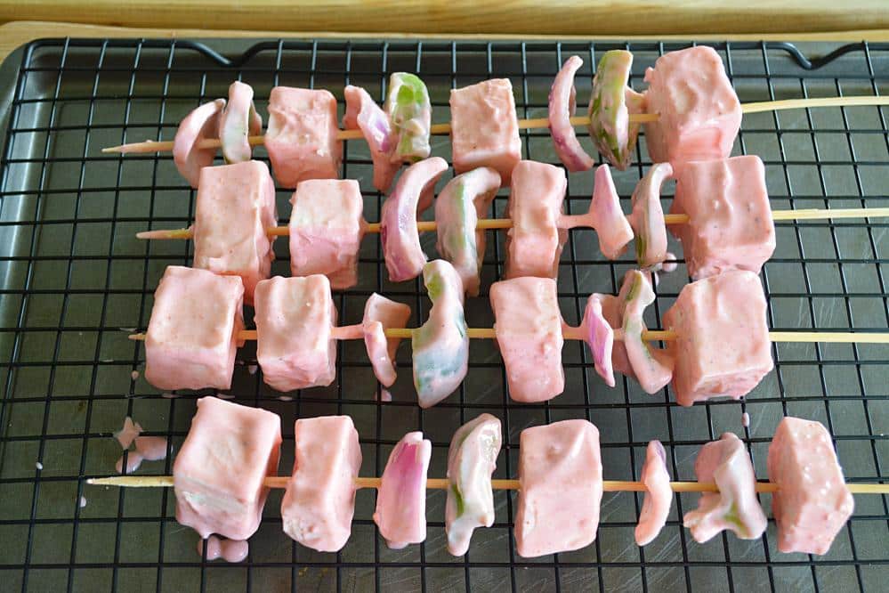 - Put skewers on a wire rack and place a tray underneath the skewers.