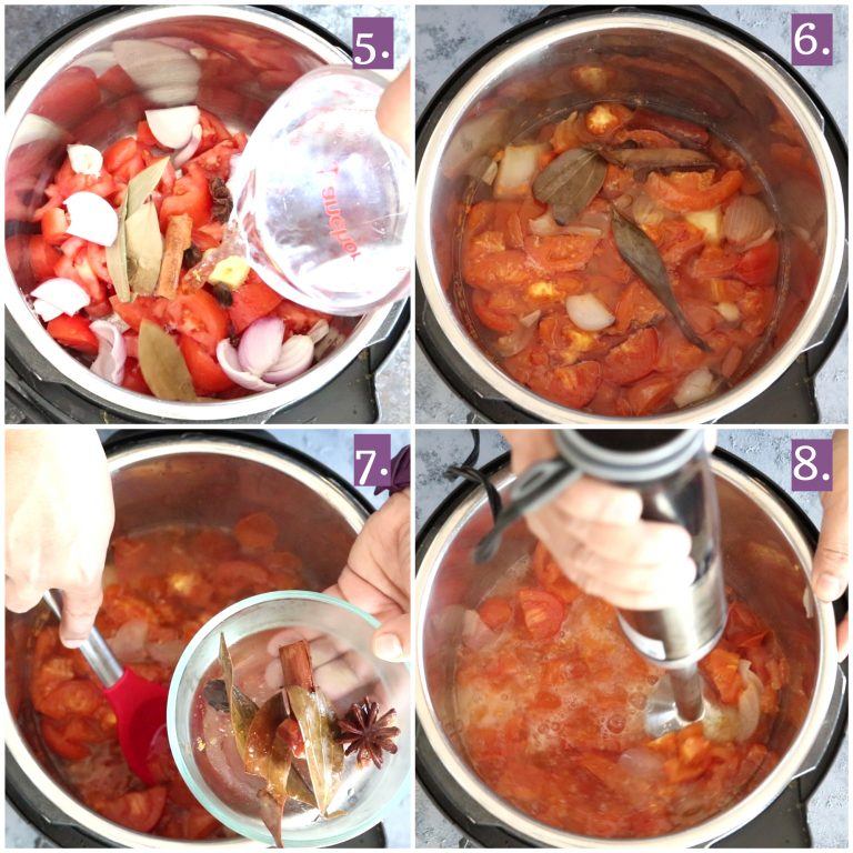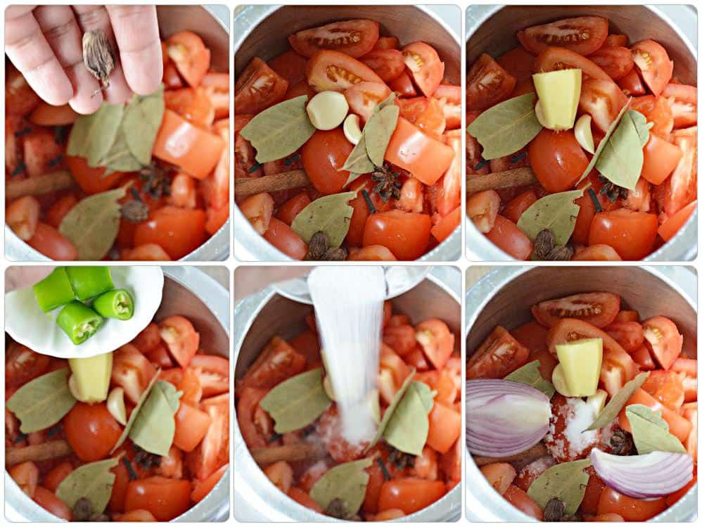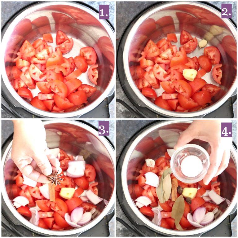 - Wash and pat dry the tomatoes. Slice tomatoes into halves. Add the sliced tomatoes to the Instant Pot insert. Add onion, green chili, ginger, and garlic. Add cinnamon stick, star anise, bay leaves, cloves, and whole black cardamom.